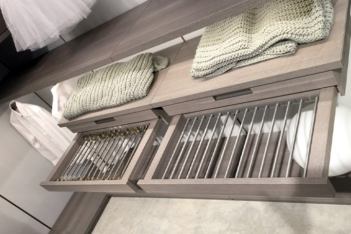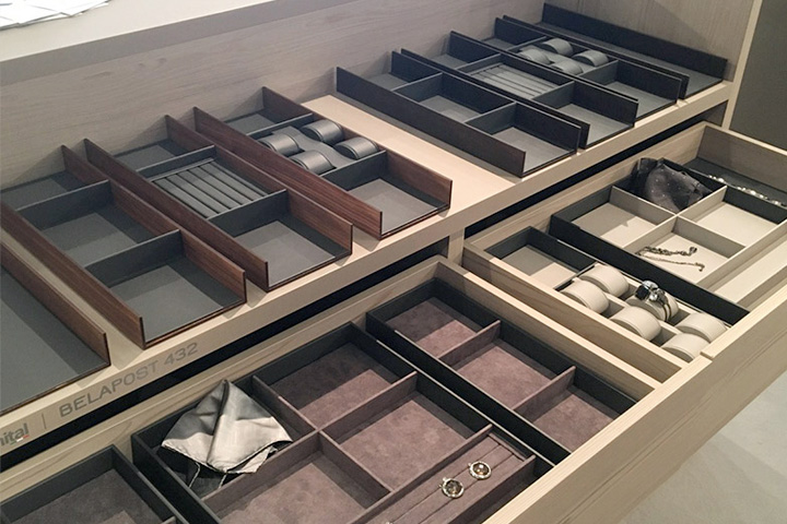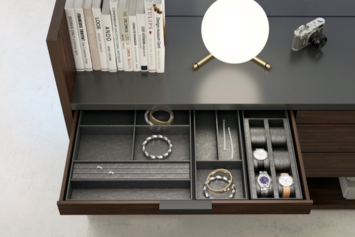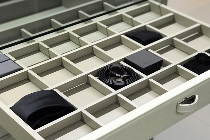 Accessory inserts or dividers for the drawers help keep any special items such as jewelry, watches, special collections, and delicate clothing clean and reachable. They also create beautiful displays, turning our favorite pieces into works of art that we can appreciate on a daily basis. Showcasing our top accessories, inserts elevate every morning routine to that of a shopping excursion in a fancy boutique.