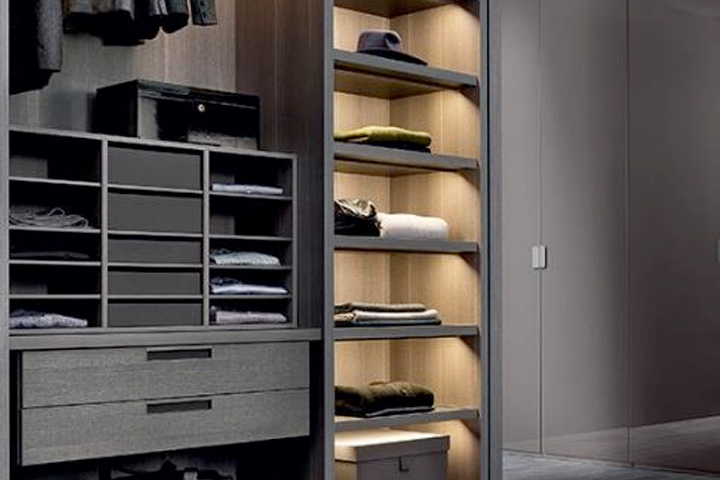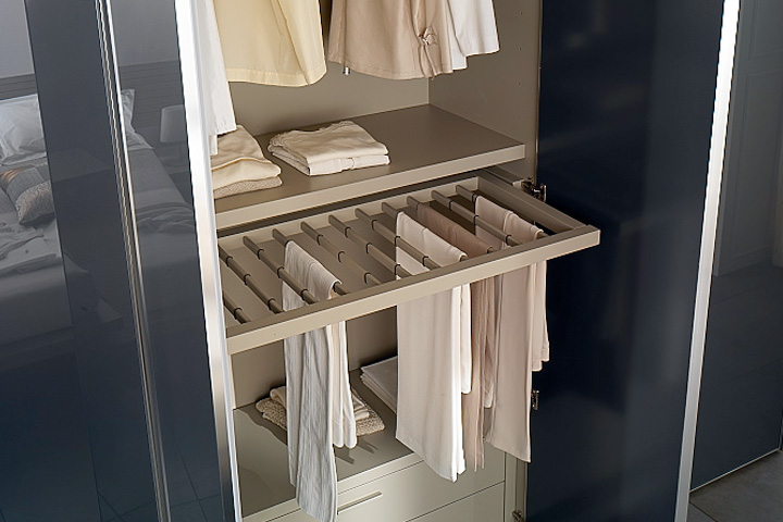 I am a huge fan of pull-out drawers and shelves and utilize them in almost every closet I design for Italkraft. The secret to making a closet as zen-like as possible is to hide any clutter while keeping our everyday elements convenient and close at hand. I utilize shelves and pigeonholes to place out the items I use most often and then I bring in both functional and fashionable elements such as the leather boxes pictured above to hide items that I don’t use as often. This creates both an aesthetic element as well as a simple way to organize unseemly clutter